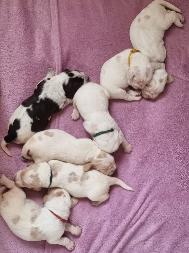 wurden am 30.November 2025 sieben Welpen in weiß-orange (vier Rüden und zwei Hündinnen) und braunschimmel (1 Hündin) geboren.
